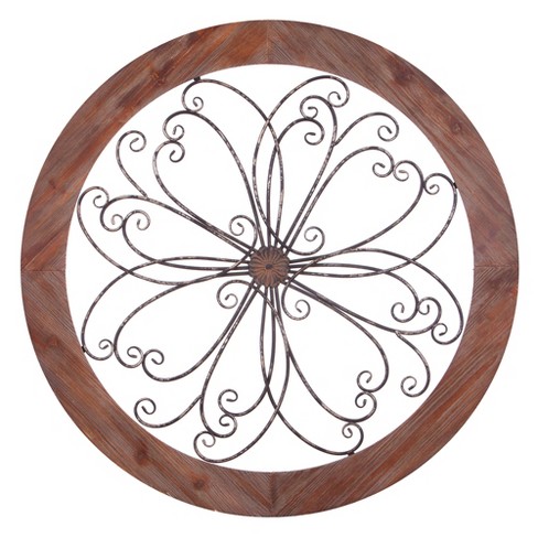 34 X34 Rustic Round Wood And Metal Decorative Scroll Wall Decor